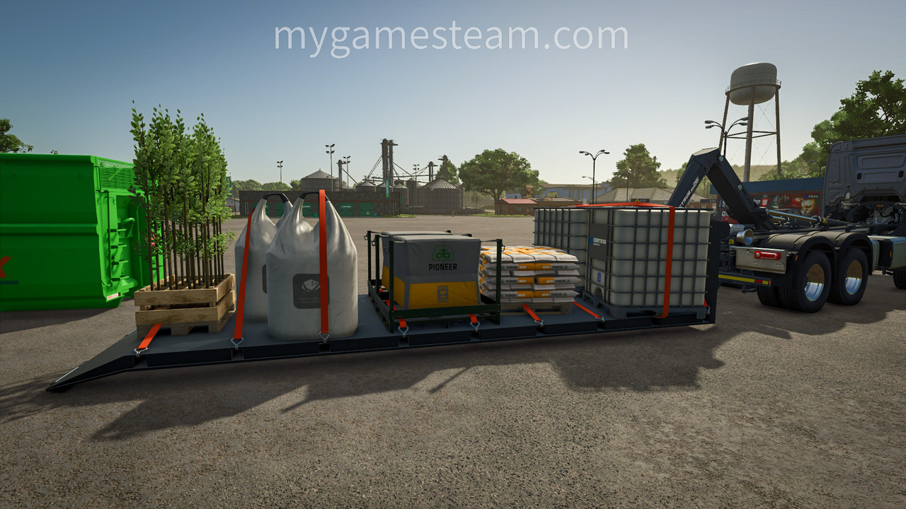 This platform can be lifted and transported with a hooklift. It is possible to transport small vehicles and equipment with it.